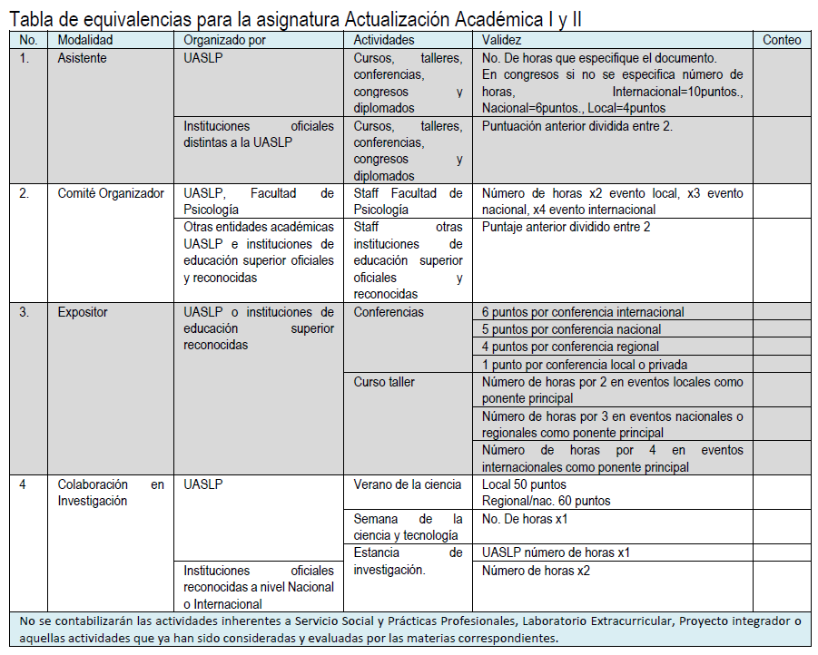 A lo largo de su trayectoria académica deberán acumular 50 puntos con base a la siguiente tabla de equivalencias: